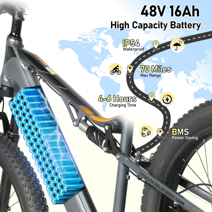 Generally, PASELEC electric bicycles have a range of 50-70 miles.